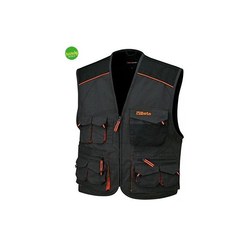 Dalla linea di articoli dedicati alla sicurezza sul lavoro a marchio Beta, GILET CON TASCHE, di colore grigio in poliestere e cotone, è ideale per tutti i lavori manuali. Presenta inserti antiabrasione sulle spalle in 'Oxford' poliestere, sei taschini frontali porta minuteria con chiusura a strappo, un taschino portapenne, una tasca al petto con tiretto e chiusura a strappo e tasconi in vita con zip e tiretto.