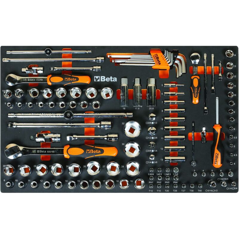 L'assortimento di utensili Beta in termoformato sono una soluzione pensata per rendere disponibile in maniera ordinata gli utensili di più comune utilizzo. Avere gli attrezzi disposti ordinatamente permette di diminuire considerevolmente il tempo impiegato nella ricerca degli utensili e consente quindi in questo modo di aumentare la produttività. Gli utensili disposti in disordine inoltre sono un rischio per la sicurezza. Questa configurazione di utensili Beta comprende 116 utensili diversi, ideale per ogni esigenza. In particolare fanno parte dell'assortimento diversi modelli di chiavi a bussola. Nello specifico Chiavi a bussola esagonali, a mano lunghe con bocca esagonale, maschio esagonali, a giravite per diversi tipi di viti e per candele. Sono forniti inoltre nel termoformato Beta, chiavi maschio esagonali piegate con estremità sferica, bussole portainserti, raccordi con attacco quadrati, prolunghe, snodi, quadri scorrevoli o con impugnatura e cricchetti reversibili. La vasta