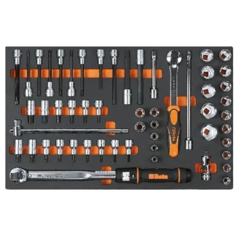 Il vassoio morbido M115 Beta è un assortimento di utensili disposti su termoformato in EVA pratico e completo. Questo prodotto si adatta perfettamente a tutti i modelli di cassettiere e carrelli arredo officina Beta, ma risulta adeguato anche per altre soluzioni di arredamento. Questo articolo è composto da: -1x Beta 666N Chiave dinamometrica a scatto 40:200 Nm -15x Beta 920A Chiavi a bussola esagonali 1/2 rispettivamente da 13 - 14 - 15 - 16 - 17 - 18 - 19 - 20 - 21 - 22 - 24 - 26 - 27 - 30 - 32 mm -7x Beta 920FTX Chiavi a bussola 1/2 per viti con teste a profilo Torx® da 12 - 14 - 16 - 18 - 20 - 22 - 24 mm -10x Beta 920PE Chiavi a bussola maschio esagonale 1/2 da 6 - 7 - 8 - 8L - 10 - 10L - 12 - 12L - 14 - 14L -16x Beta 920TX Chiavi a bussola maschio per viti con impronta Torx® 1/2 misure T20 - T25 - T27 - T30 - T40 - T45 - T50 - T55 - T60 - T20L - T25L - T27L - T30L - T40L - T45L - T50L -1x Beta 920/21 Prolunga 1/2 da 125 mm -1x Beta 920/22 Prolunga 1/2 da 255 mm -1x Beta 920/25
