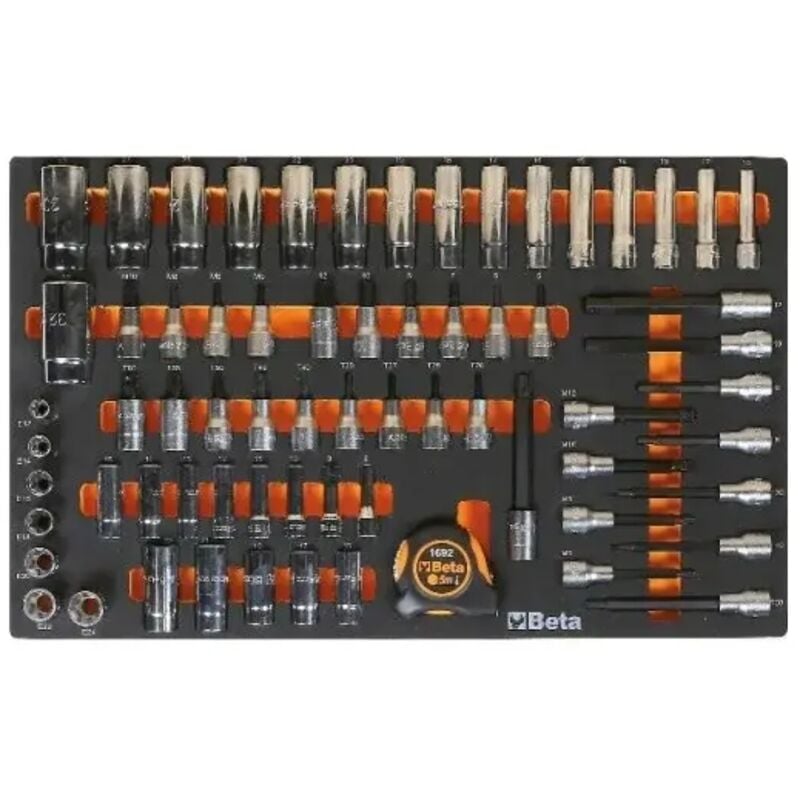 Il vassoio morbido M125 Beta è un assortimento di utensili disposti su termoformato in EVA, pratico e completo. Questo prodotto si adatta perfettamente a tutti i modelli di cassettiere e carrelli arredo officina Beta, ma risulta adeguato anche per altre soluzioni di arredamento. Questo articolo è composto da: - 13x Beta 910AL Chiavi a bussola lunghe esagonali 3/8 da 8 - 9 - 10 - 11 - 12 - 13 - 14 - 15 - 16 - 17 - 19 - 21 - 22 mm - 10x Beta 920PE Chiavi a bussola maschio esagonali 1/2 da 5 - 6 - 6L - 7 - 8 - 8L - 10 - 10L - 12 - 12L mm - 7x Beta 920FTX Chiavi a bussola 1/2 per viti Torx® misure E12 - E14 - E16 - E18 - E20 - E22 - E24 - 13x Beta 920TX Chiavi a bussola maschio 1/2 per viti Torx® misure T20 - T25 - T27 - T30 - T30L - T40 - T40L - T45 - T50 - T50L - T55 - T60 - T60L - 8x Beta 920XZN Chiavi a bussola maschio 1/2 a profilo XZN da 5 - 6 - 6L - 8 - 8L - 10 - 10L - 12L mm - 16x Beta 920AL Chiavi a bussola lunghe esagonali 1/2 rispettivamente da 10 - 12 - 13 - 14 - 15 - 16 - 17