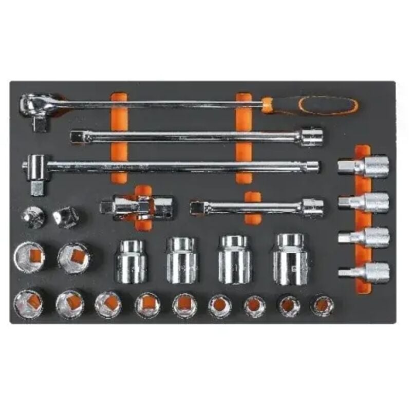 Il vassoio morbido M126 Beta è un assortimento di utensili disposti su termoformato in EVA, pratico e completo. Questo prodotto si adatta perfettamente a tutti i modelli di cassettiere e carrelli arredo officina Beta, ma risulta adeguato anche per altre soluzioni di arredamento. Questo articolo è composto da: - 15x Beta 928A Chiavi a bussola esagonali 3/4 con attacco quadro femmina da 19 - 21 - 22 - 24 - 26 - 27 - 28 - 30 - 32 - 34 - 35 - 36 - 38 - 41 - 46 mm - 4x Beta 928ME Chiavi a bussola maschio esagonale con attacco quadro femmina 3/4 cromate da 14 - 17 - 19 - 22 mm - 1x Beta 928/15 Raccordo con attacco quadro femmina 3/4 e maschio 1/2 cromato - 1x Beta 928/16 Raccordo con attacco quadro femmina 3/4 e maschio 1 cromato - 1x Beta 928/21 Prolunga cromata 3/4 200 mm - 1x Beta 928/22 Prolunga cromata 3/4 380 mm - 1x Beta 928/25 Snodo con attacchi quadri maschio e femmina 3/4 cromato - 1x Beta 928/42 Quadro maschio 3/4 con spina scorrevole 450 mm - 1x Beta 928/55 Cricchetto
