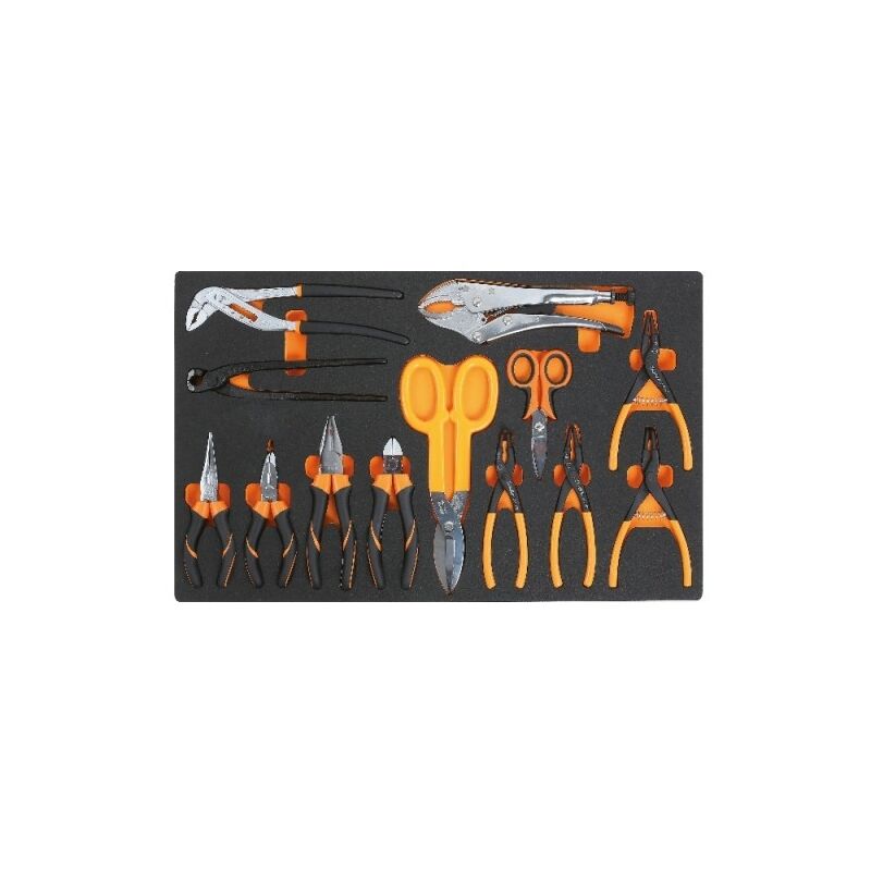 Il vassoio morbido M129 Beta è un assortimento di utensili disposti su termoformato in EVA pratico e completo. Questo prodotto si adatta perfettamente a tutti i modelli di cassettiere e carrelli arredo officina Beta, ma risulta adeguato anche per altre soluzioni di arredamento. Questo articolo è composto da: - 1x Beta 1032 Pinze a becchi dritti per anelli elastici, fori 180 mm - 1x Beta 1034 Pinze a becchi piegati per anelli elastici, fori 170 mm - 1x Beta 1036 Pinze becchi dritti per anelli elastici, per alberi 175 mm - 1x Beta 1038 Pinze a becchi piegati per anelli elastici, per alberi 175 mm - 1x Beta 1048 Pinze regolabili a cerniera chiusa 250 mm - 1x Beta 1052 Pinza autobloccante 240 mm - 1x Beta 1082BM Tronchesi a taglienti diagonali 160 mm - 1x Beta 1098 Tenaglie per cementisti 220 mm - 1x Beta 1112 Cesoia a lame larghe dritte 250 mm - 1x Beta 1128BM Forbici per elettricisti a lame dritte - 1x Beta 1150BM Pinza universale 180 mm - 1x Beta 1166BM Pinza a becchi mozzotondi dritti