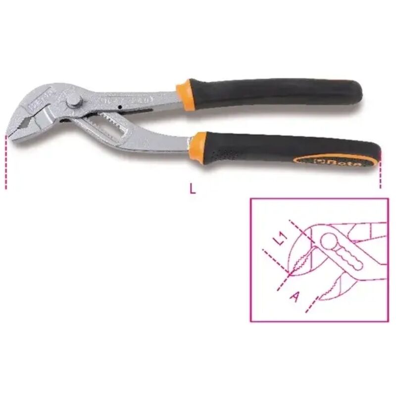 Pinza Beta Tools 1047/240 con regolazione ottima delle ganasce mediante un pulsante contro i movimenti accidentali della regolazione. Profio adatto alla presa dei dadi e tubi grazie anche alla dentatura autobloccante. Trattamento termico localizzato sulle ganasce e manici isolati in PVC. Lunghezza 240 mm e max apertura delle ganasce di 36 mm.