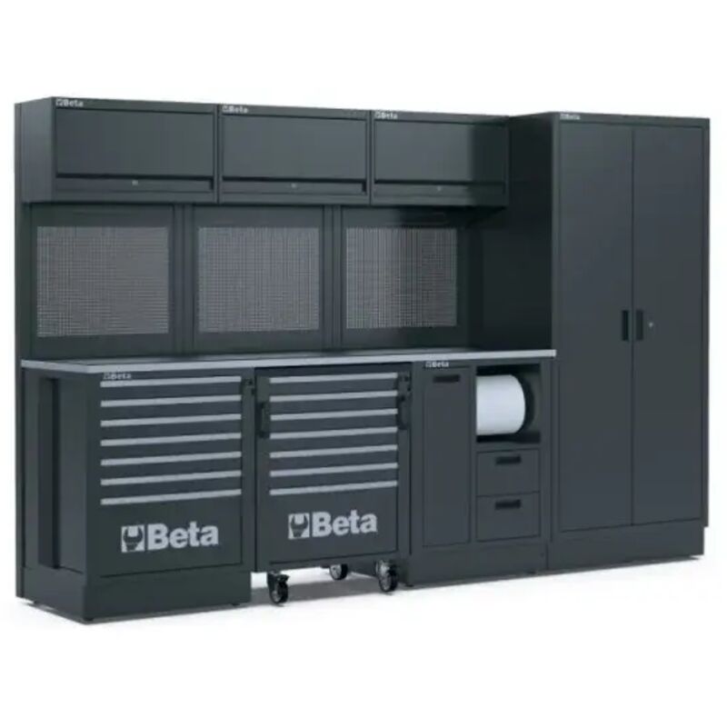 La combinazione completa arredamento officina 050001030 Beta RSC50 F è la soluzione ideale per l'arredo di garage ed officine professionali: versatile, ampia e spaziosa, questa arredo officina è la risposta a tutte le necessità del professionista.Questa nuova linea di arredamento per officine è caratterizzata dalla facilità di montaggio, studiata per rendere le operazioni iniziali il più rapido possibile e semplificare l'installazione della composizione. Realizzata e progettata in Italia, questa nuova linea Beta RSC50 è indicata per la realizzazione di soluzioni personalizzate grazie al sistema modulare che consente di selezionare i pezzi di arredamento più indicati alle proprie necessità, oppure semplicemente scegliendo una soluzione completa preimpostata.Le cassettiere offrono ampio spazio per riporre i propri utensili manuali e non solo: infatti grazie alle misure standard interne dei cassetti risultano compatibili con un'ampia gamma di termoformati morbidi e rigidi Beta