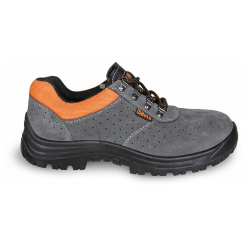 Scarpe antinfortunistiche BETA, mod. 7346E basse. In pelle scamosciata traforata. Tomaia: Pelle scamosciata traforata Suola: Poliuretano bidensità Puntale: Acciaio, resistenza 200 Joule Antiperforazione: Acciaio elastico Sottopiede: Carbon in feltro Peso: 600 g