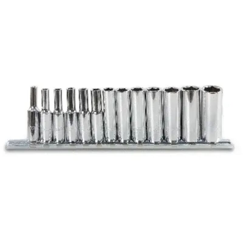 Serie di chiavi a bussola lunghe con attacco quadro femmina 1/4 bocca esagonale, cromate. Attacco: 1/4 Profilo: Esagonale Unità di misura: Millimetri Lunghezza: 50 mm Tipologia: Lunga Trattamento: Cromata Contenuto serie: 4-4,5-5-5,5-6-7-8-9-10-11-12-13-14 mm Pezzi per confezione: 13 Certificazione: Uni/iso 2725 din 3124