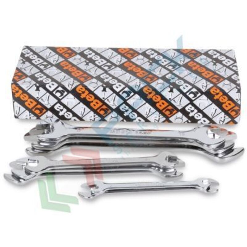 Serie di 8 chiavi a forchetta doppie (art. 55MP) Finitura cromata lucida. Misure: 6x7 - 8x9 - 10x11 - 12x13 - 14x15 - 16x17 - 18x19 - 20x22 mm