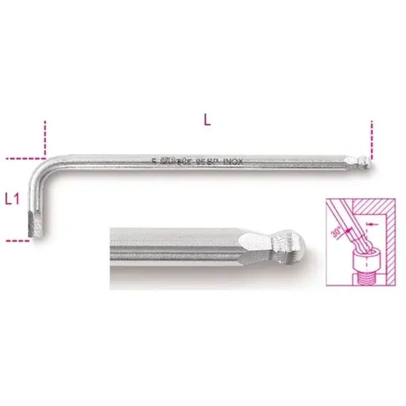 Serie di 6 chiavi maschio esagonale piegate con estremità sferica, in acciaio inossidabile, in busta. Contenuto serie: 2,5-3-4-5-6-8 mm N. articoli: 6 Tipologia: Estremità sferica Unità di misura: Millimetri Profilo: Brugola Trattamento: Acciaio inossidabile Inclinazione: 90