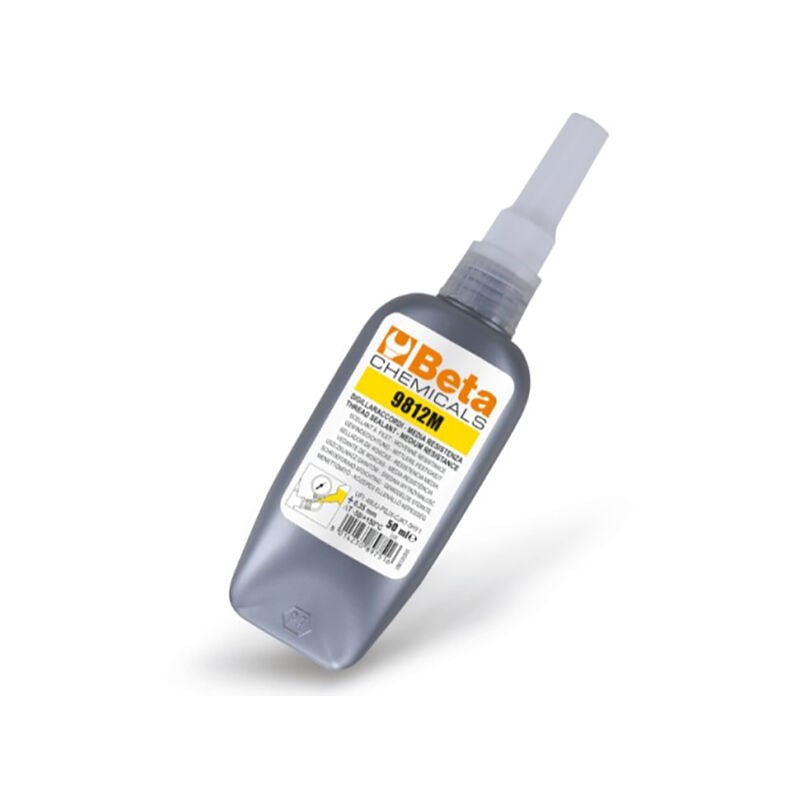 Ideale per sigillare raccordi filettati soggetti a manutenzione periodica. Permette lo smontaggio con l'uso di utensili manuali. Sigillaraccordi anaerobico per raccordi metallici filettati. Polimerizza a contatto con parti metalliche rettificate e in assenza di ossigeno. Garantisce una perfetta tenuta stagna verso liquidi e gas. Aumenta la robustezza del giunto. Tollera la leggera contaminazioni di olii. Elevata resistenza chimica (olii, acqua, gas). Protegge le filettature da corrosione e grippaggi da corrosione. Caratteristiche tecniche del sigillaraccordi BETA CHEMICALS 9812M T50 Temperatura: -50/+150 °C Gioco diametrale: 0,35 mm Velocità di reazione blocco alla mano: 12/18 minuti Indurimento funzionale: 3-6 ore Viscosità 25°C: 20.000/40.000 mPa.s Coppia di svitamento INIZIALE: 27-35 Nm (ISO-10964) Coppia di svitamento RESIDUA: 20-30 Nm (ISO-10964)