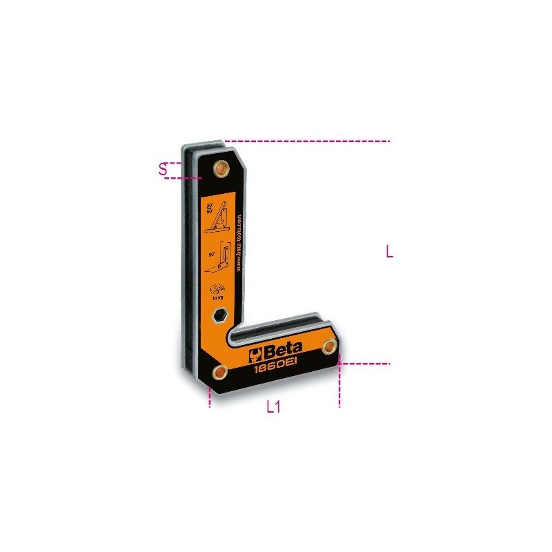 Squadra magnetica 90°, per angoli interni ed esterni - Beta 1860EI Ideale per bloccare particolari tubolari o piatti 18Kg di forza magnetica Con smussi per angoli da 30 e 60° Con foro esagonale per facilitare il distacco del magnete dal metallo