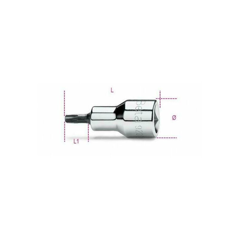 Descrizione CHIAVE A BUSSOLA TX 55 DA 1/2 BETA-920 Chiave a bussola maschio per viti con impronta Torx®, con attacco quadro femmina da 1/2, cromata con inserti bruniti. Caratteristiche: Torx: T55 Ø mm: 23 L mm: 58 L1 mm: 20