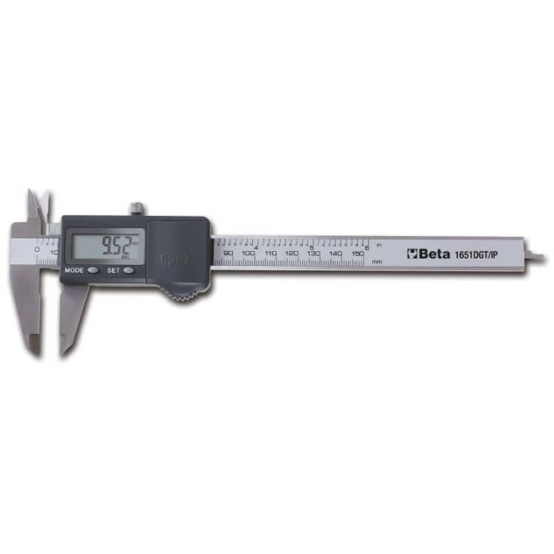 Calibro digitale Beta a corsoio lettura centesimale 1651 DGT Calibro digitale in acciaio inossidabile temprato con lettura centesimale, fornito in astuccio rigido in materiale plastico. Bloccaggio a vite del corsoio, conversione mm/pollici. Protezione IP67, garantisce una totale protezione alle polvere e liquidi. Dati Tecnici Lunghezza Calibro 225mm Apertura Massima 150mm Peso: 450 gr