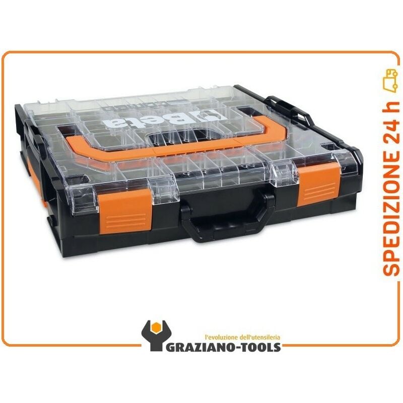 Le valigette porta attrezzi possono essere facilmente unite tra di loro con un semplice clic, grazie alle pratiche chiusure laterali a scatto. Possono inoltre essere combinate a seconda delle proprie esigenze. Caratteristiche principali: • Coperchio trasparente in robusto policarbonato per una rapida individuazione del contenuto • Dimensioni esterne 445x358x118 mm • Capacità di carico max interna 25 Kg • Predisposizione per la chiusura con lucchetto • Peso 2,5 Kg Il sistema Beta Combo C99V0 è compatibile con lo standard L-BOXX di Sortimo®.