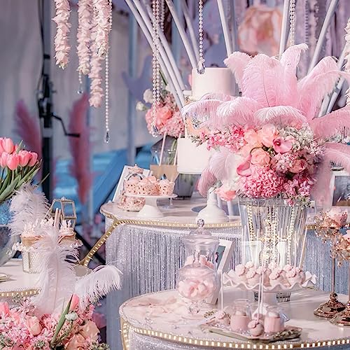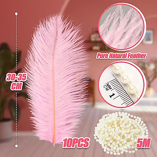 BETESSIN Piume di Struzzo Decorative Lunghe 30-35cm Ghirlanda di Perle Finte Fili Bianco Piume di Struzzo per Decorazione Matrimonio Nozze Festa Addio al Nubilato Notte Carnevale Halloween Rosa