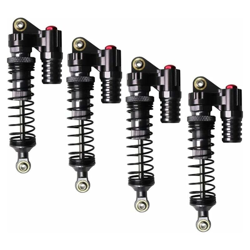 Applicazione: Modello di auto 1/10 RC SCX10, Wrangler RC4WD D90, Tamiya CC01, Ghost, ecc. Assorbe efficacemente le vibrazioni su strade sconnesse e riduce l'impatto della velocità. Materiale del prodotto: lega di alluminio, rivestimento in titanio sulla superficie. È durevole, di buona qualità, resistente agli urti, alla corrosione. Distanza da foro a foro (compressione): 65 mm. Distanza da foro a foro (non compresso): 90 mm.Lunghezza totale: 100 mm Lunghezza corsa: 25 mm.Diametro molla: 1,2 mm Diametro dell'albero centrale: 3,5 mm Larghezza del tallone della rotula: 7,5 mm. La caratteristica del doppio ammortizzatore a pressione negativa è l'aggiunta di un cilindro secondario accanto al corpo del cilindro principale. La funzione principale è aumentare la capacità dell'olio dell'ammortizzatore e allo stesso tempo semplificare il metodo di regolazione della forza di smorzamento per evitare ai giocatori di regolare l'ammortizzatore. Quando la forza di smorzamento dell'olio viene