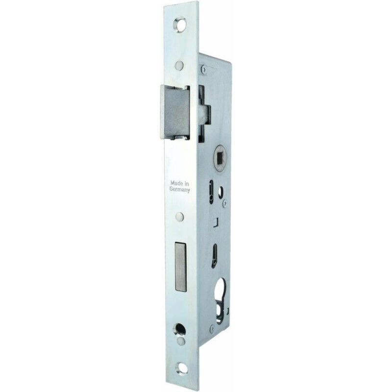 Serratura a telaio tubolare 1004 PZW - Frontale piatto in acciaio. zincato - Meccanica. Bloccaggio e sbloccaggio manuale - Quadrato. 245 x 24 mm - Cilindro professionale forato - Distanza 92 mm - Seguito della maniglia a leva in acciaio inox fuso. 8 mm. 3 parti - Scrocco reversibile a destra o a sinistra dopo l'installazione - Profondità di installazione cassa serratura 30,5 mm. chiusa - Battente in alluminio a un'anta.