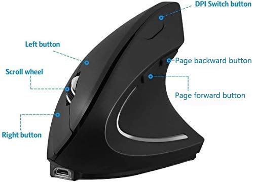 BeWishes Mouse verticale ergonomico USB Wireless Mouse ergonomico, 2.4G, mouse ottico verticale ricaricabile ad alta precisione regolabile 800/1200/1600 DPI, 5 pulsanti per PC/laptop/Mac