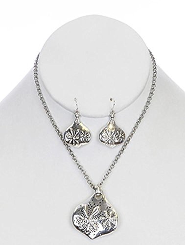 Beyoutifulthings Collana da donna in acciaio inox, con ciondolo a forma di fiore martellato, lunghezza 35,6 cm, 1 paio di orecchini, piastra, argento, lunghezza 5,1 cm