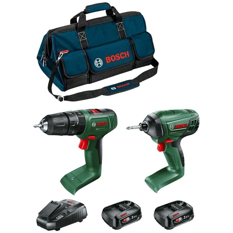 BOSCH HG Kit BHGK202 Trapano a Percussione BOSCH HG EasyImpact 18V-40 - Questo Trapano a Percussione a batteria Easy 18V-40 è il tuttofare ideale per un'ampia varietà di lavori di foratura e fissaggio - Il suo cambio a 2 velocità consente una foratura rapida e un avvitamento potente, mentre i suoi 20 livelli di coppia forniscono la massima precisione di avvitamento - Il mandrino monopezzo da 13 mm semplifica la sostituzione di punte e punte - Il suo design ergonomico e le luci a LED integrate favoriscono un lavoro confortevole ed efficiente anche in aree scarsamente illuminate - Questo strumento è la prima scelta quando si tratta di lavorare con legno, metallo, plastica o muratura - POWER FOR ALL: una batteria ed un caricabatterie per un'intera gamma di utensili Home & Garden - Categoria Easy: focalizzato sulla semplicità, per lavori di piccola/media portata Avvitatore a massa battente BOSCH HG AdvancedImpactDrive 18 - Avvitatore a massa battente a batteria compatto e potente: la
