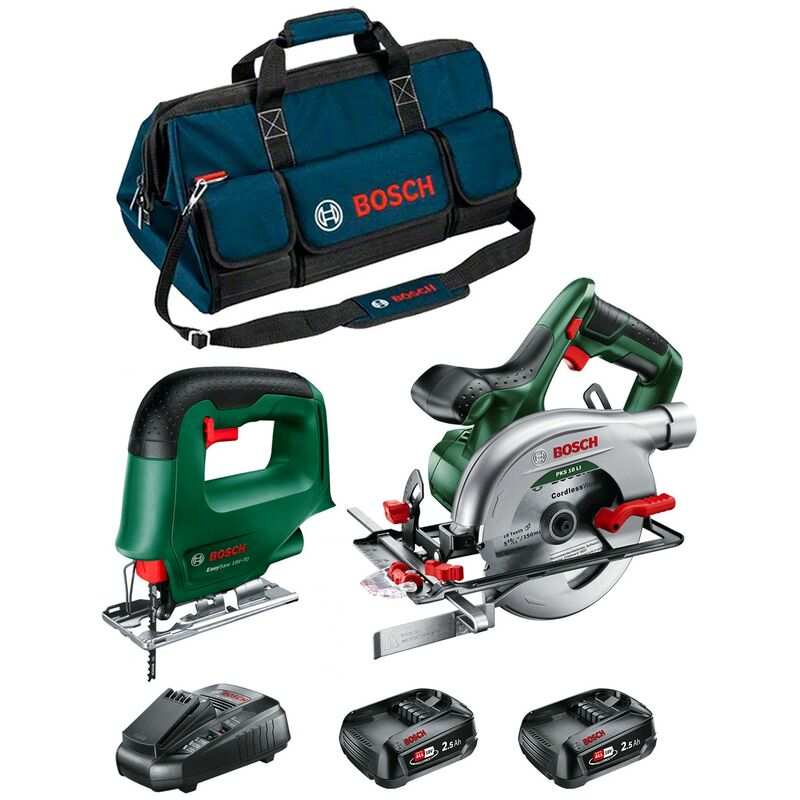 BOSCH HG Kit BHGK203 Seghetto Alternativo BOSCH HG EasySaw 18V-70 - Semplice e affidabile, il Seghetto Alternativo Easy 18V-70 è la scelta affidabile per il fai-da-te di interni e i progetti creativi - Azionato senza sforzo con un solo pulsante, questo seghetto alternativo leggero esegue tagli diritti e curvi fino a 70 mm di profondità nel legno, come scaffalature in legno o pavimenti in laminato, e fino a 6 mm di profondità nel legno. - Il controllo della velocità per l'avvio graduale dell'utensile e la regolazione della velocità offrono ulteriore comfort - Per garantire tagli precisi, le linee della sega rimangono visibili grazie a una speciale funzione di soffiaggio che soffia via la segatura - La lama della sega si cambia facilmente grazie al sistema SDS integrato - POWER FOR ALL: una batteria ed un caricabatterie per un'intera gamma di utensili Home & Garden - Categoria Easy: focalizzato sulla semplicità, per lavori di piccola/media portata Sega Circolare BOSCH HG PKS 18 LI