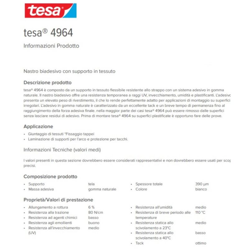 Biadesivo TESA Poroso 4964, colore Bianco, largo 19 mm per una lunghezza totale del rotolo di 25 MT . Questo speciale Biadesivo è composto da un supporto in tessuto flessibile resistente allo strappo con un sistema adesivo in gomma naturale presenta un elevato peso di rivestimento, il che lo rende perfettamente adatto per applicazioni di montaggio su superfici irregolari . Tesa 4964 offre una resistenza temporanea a raggi UV, invecchiamento, umidità e plastificanti . DATI TECNICI: - Colore Bianco - Larghezza 19 mm - Lunghezza 25 MT