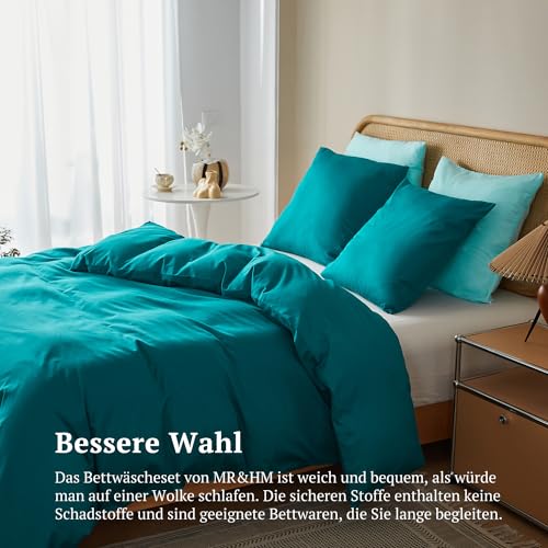 MR&HM Biancheria da letto 200 x 220 cm, 3 pezzi, in cotone, 100% cotone, 200 x 220 x 1 Plus, due federe 80 x 80 cm, con chiusura lampo, morbida e confortevole, colore: blu e verde