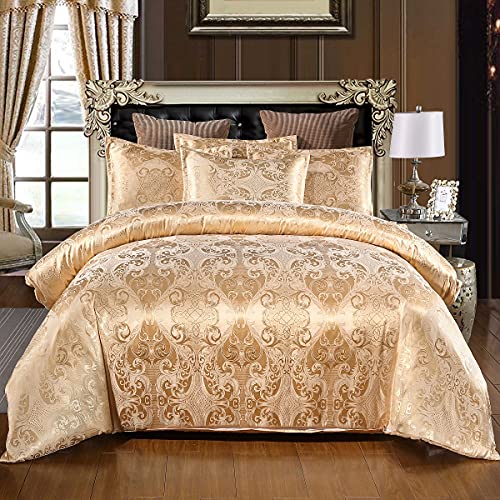 Biancheria da letto 135 x 200 cm, 4 pezzi, oro giallo satinato con motivo floreale in jacquard, set copripiumino e federa 80 x 80 cm