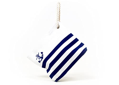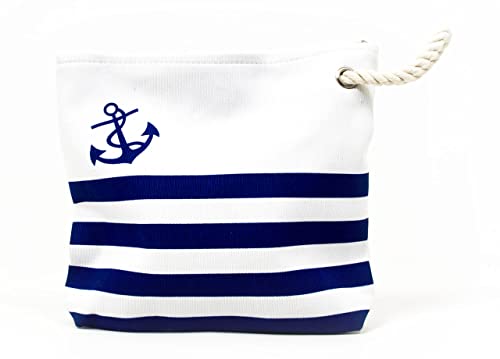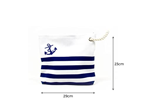 DESIGN MODERNO - Pratica Pochette Da Spiaggia Moderna Ed Elegante Fantasia Rigata A Righe Stripe Colore Bianco E Blu Con Piccola Ancora Nell'angolo Superiore. Pochette Spiaggia Comodamente Lavabile In Lavatrice A 30°;