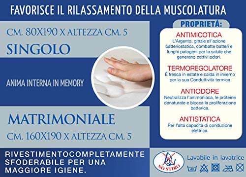 ANTIBATTERICO - Topper Copertura Materasso In Fibra D'Argento Antibatterico E Antiacaro, Protegge Il Materasso Da Impurità E Batteri. Anima Interna In Memory Rivestita In tessuto In Fibra D'Argento Termoregolatore, Fresco In Estate E Caldo In Inverno Grazie Alla Sua Conduttività Termica