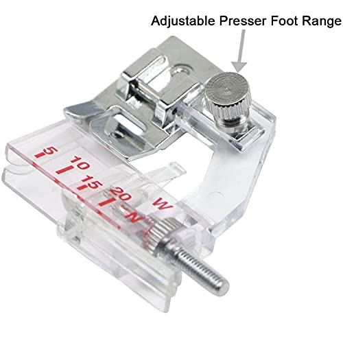 Adatto per Brother, Janome, Singer, Babylock, Kenmore e molte altre macchine da cucire che utilizzano un piede snap-on. La gamma regolabile è da 5 mm a 20 mm.