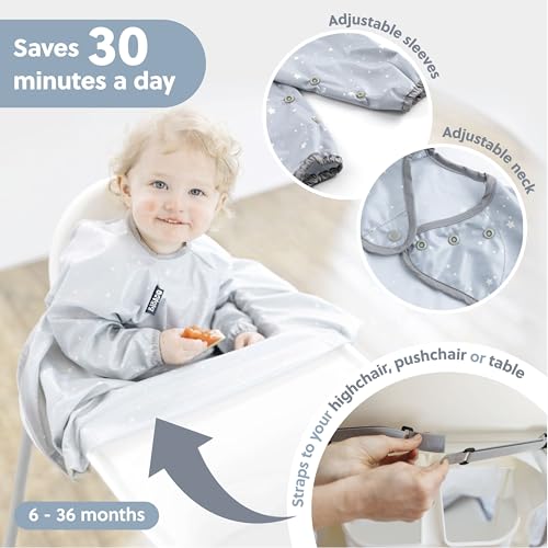 BAVAGLINI PER NEONATI CON MANICHE REGOLABILI - Il nostro bavaglino regolabile si adatta perfettamente a qualsiasi seggiolone, con o senza vassoio. Attacca semplicemente il tuo bavaglino in silicone a qualsiasi seggiolone, carrozzina o tavolo per mantenere pulito e asciutto anche il più disordinato dei bambini.