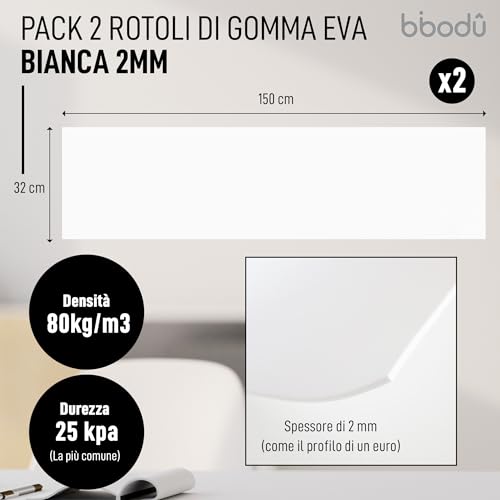 BIBODU Pacco 2 Rotoli di Gomma Eva Bianca 2mm di Spessore | Dimensioni Fogli 150cm x 32cm, Densità 80 kg/m3 | Eva Foam Bianco per Creazioni DIY, Foam Cosplay, Halloween | Adatto Bambini