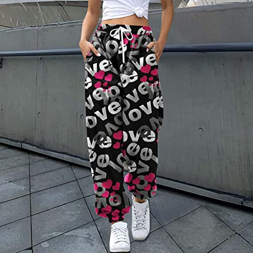 BIBOKAOKE Pantaloni da jogging da donna con stampa amore, a vita alta, in gomma, casual, con coulisse e tasche, pantaloni da corsa