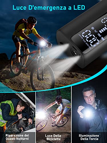【Compressore portatile con alta capacità】Il compressore portatile auto BIBURY ha una batteria integrata da 4000mAh (2x2000mAh) e può gonfiare fino a 4 pneumatici per auto quando è completamente carico. Mini compressore portatile BIBURY con 5 diversi adattatori di ugelli per gonfiare oggetti come auto, bici, moto e pneumatici per palloncini, il gonfia gomme auto portatile è una pompa aria compatta e portatile che misura 15.3x6.2x4.5 cm per una portabilità ottimale.