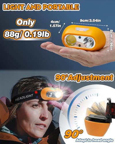 【Leggero & Regolabile】La lampada frontale ricaricabile è dotata di fascia regolabile, lampada frontale, clip per penna e cavo di ricarica. La torcia frontale led ricaricabile libere pesa solo 0.19 libbre, il design di piccole dimensioni può essere piegato e facilmente messo in tasca. L'archetto elastico può essere facilmente regolato in lunghezza per adattarsi perfettamente alle dimensioni della testa. La testa della lampada è regolabile a 90° per indirizzare la luce esattamente dove serve.