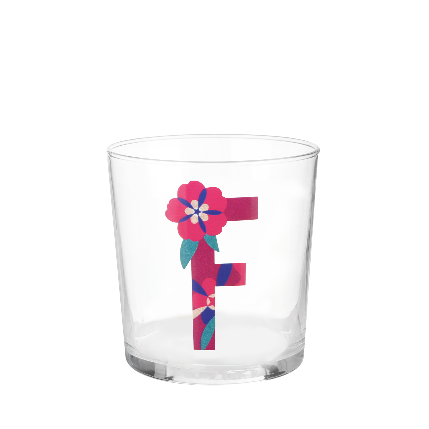 Crea il tuo set personalizzato con le iniziali di tutta la famiglia con questa graziosa linea di bicchieri sfusi in vetro decorato. Caratterizzato da una grande F fucsia al centro con dettagli floreali, il bicchiere è ideale per gustare a tavola acqua e altre bibite. Sarà una perfetta idea segnaposto o da regalare ad amici e parenti il cui nome inizia con questa lettera. Lavabile in lavastoviglie. Capacità: 360 ml.