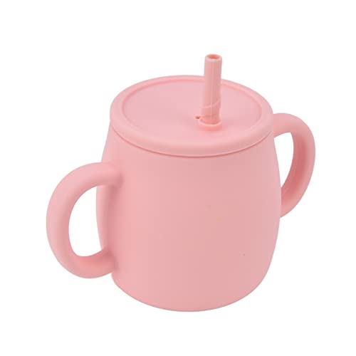 Bicchiere per l'apprendimento del bambino, silicone morbido per uso alimentare infrangibile 280 ml Bicchiere per bambini in silicone antiscivolo con doppio manico con coperchio in paglia(rosa)