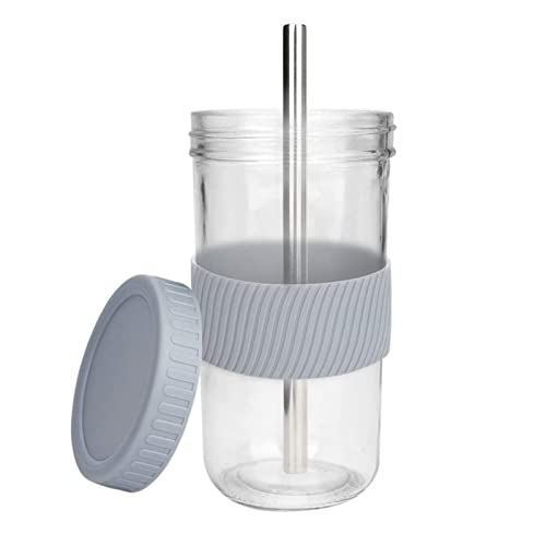 Bicchiere con cannuccia, bicchieri per conserve, bicchieri riutilizzabili in vetro con cannuccia e coperchio per succhi di smoothie (grigio)