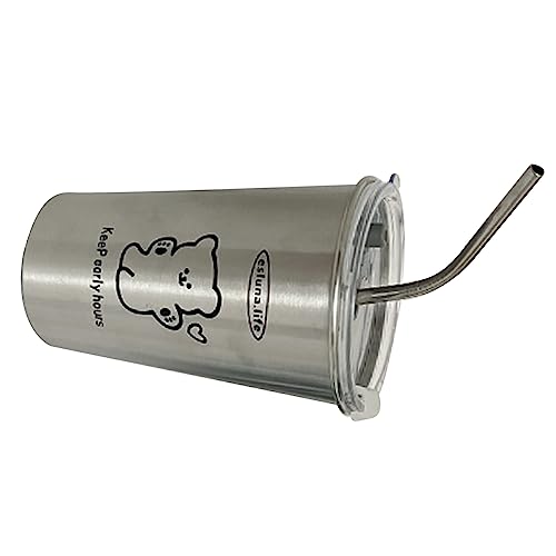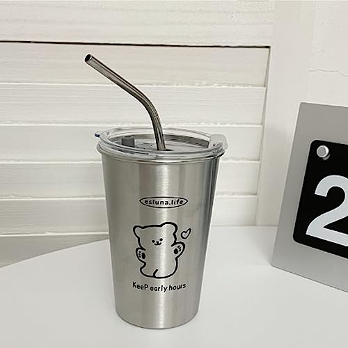 Bicchiere Freddo da 500 Ml Bottiglia D'acqua in Acciaio Inossidabile Riutilizzabile Tazza da Caffè Ghiacciata Isolata Bicchiere Isolato con Coperchio e Cannuccia per Acqua, Tè Freddo o(Orso felice)