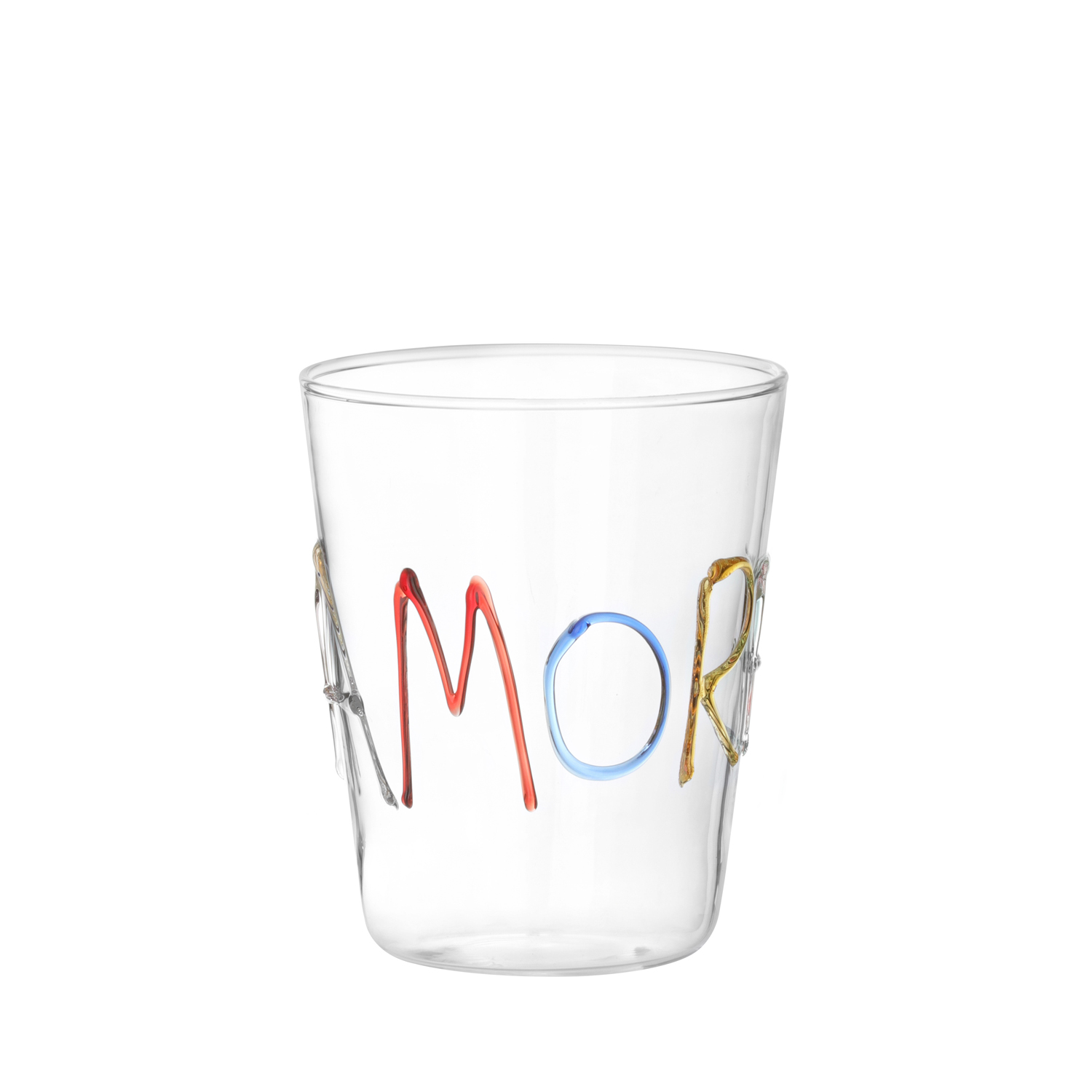 La linea di bicchieri in vetro borosilicato, completa di colorata scritta in rilievo, porta eleganza e originalità sulla tua tavola. Il fresco e moderno design, firmato Benny Setti e realizzato in esclusiva per , rende questo bicchiere un accessorio unico e perfetto per creare un set personalizzato con gli altri della linea. Modello con scritta Amore e capacità 380 ml. Misure: diametro superiore 9 cme e diametro fondo 6 cm.