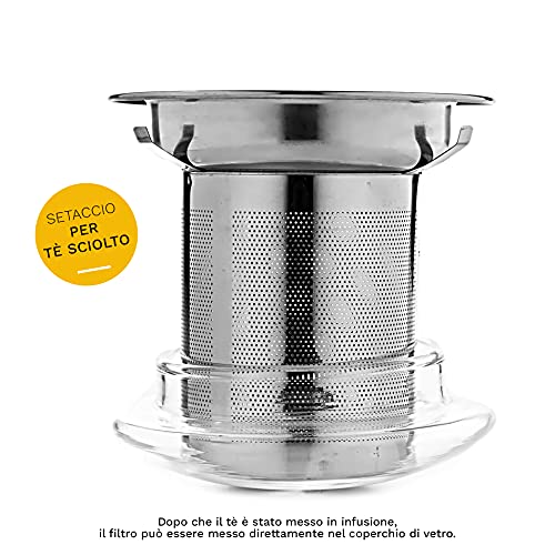 CARATTERISTICHE SPECIALI: Il filtro in acciaio inossidabile è a pori estremamente fini, in modo che tutte le particelle vengano trattenute e non penetrino nel vetro. Non appena il tè ha finito di fermentare, il filtro può essere posizionato direttamente nel coperchio.