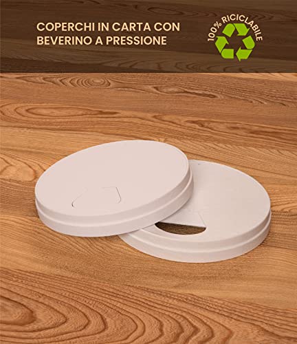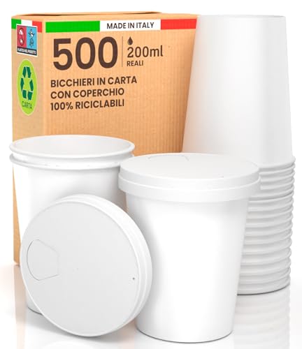 500 Bicchieri in Carta Bianchi 200ml con Coperchio in carta Ecologici Biodegradabili Monouso Made in Italy da Asporto Bevande Calde Acqua + 500 coperchi - Prodotto e confezionato in Italia
