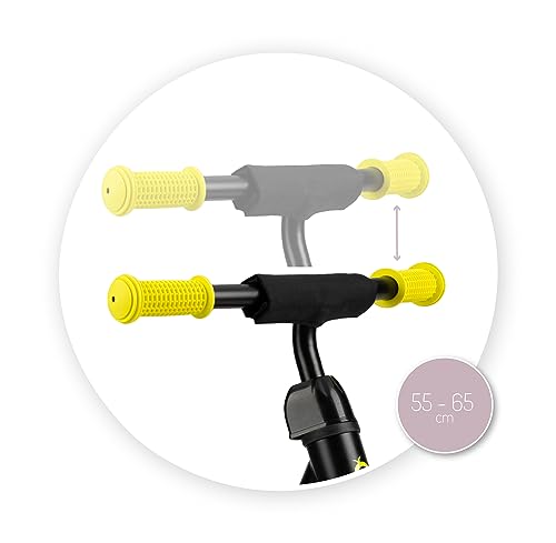 Altezza regolabilei: l'altezza della sella (da 30 a 40 cm) e del manubrio (da 55 a 65 cm) può essere regolata tramite un morsetto a sgancio rapido. Il blocco del manubrio, che impedisce la torsione del manubrio in caso di caduta, offre un'ulteriore sicurezza