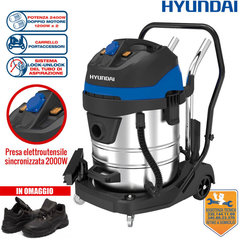Aspira tutto inox 2400W - 60 Lt. con presa sincronizzata 2000W IN OMAGGIO: scarpe antinfortunistiche in pelle impermeabili La foto delle scarpe è puramente indicativa. Il modello potrebbe cambiare in base alle disponibilità di magazzino. Presa per elettroutensile sincronizzata 2000W Altamente professionale il bidone aspiratutto Hyundai 45060 è una macchina eccezionale per aspirare solidi e liquidi, soffiare foglie, piccoli detriti, segatura, scarti di lavorazione con estrema facilità. Dotato di 2 motori da 1200 W ciascuno, può essere utilizzato al massimo della potenza (2400 W) o con un solo motore, secondo le necessità, senza perdere affidabilità e funzionalità. La struttura è compatta e ben equilibrata con gli accessori collocati in posizione ottimale;