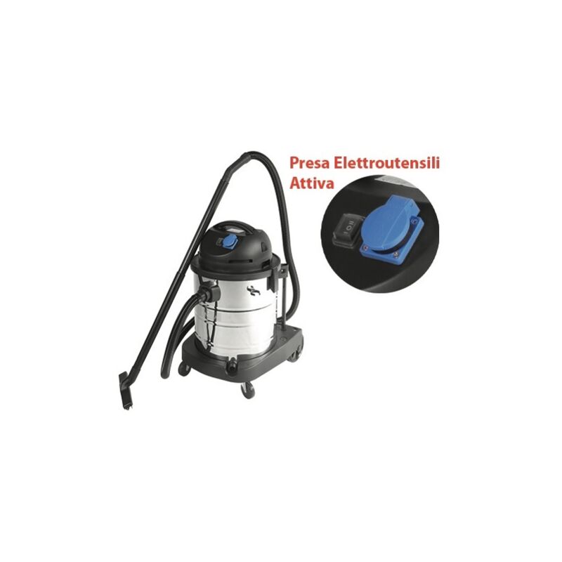 BIDONE ASPIRATUTTO DOMO RAC INOX LT. 50 Aspira solidi e liquidi, 230V-50Hz, 1400 Watt, fusto inox 50 Lt., cavo 3,5 mt., peso 11,8 kg., filtro polipropilene. Presa Elettroutensile attiva IP54. Accessori in dotazione: tubo flessibile 2,5 mt. - 2 tubi rigidi - lancia - impugnatura curva - corpo spazzola (liquido + setolato) - 2 ruote piroettanti - 2 ruote fisse, 1 sacchetto carta