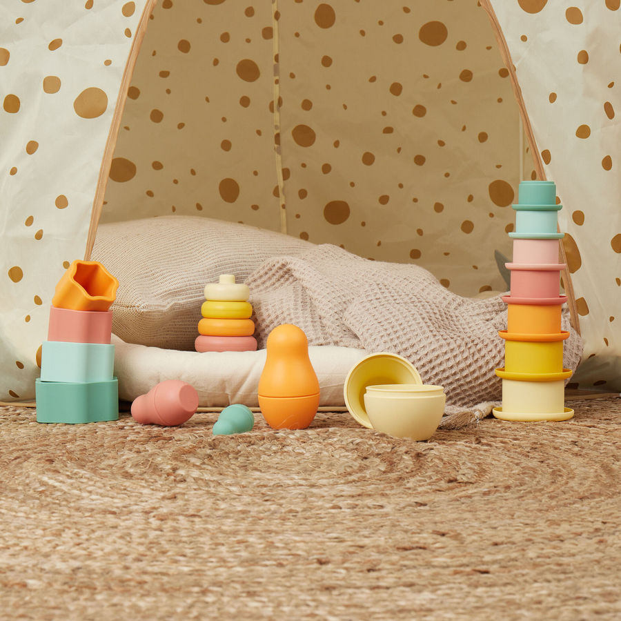 Dettagli del prodotto: Età: da 12 mesi in su Set di 4 pezzi impilabili in 100% silicone La coordinazione e la motricità fine sono incoraggiate quando si impilano e si appuntano i fiori Il silicone è resistente, infrangibile e facile da pulire con acqua e sapone neutro. Scoprite la gamma di prodotti bieco Tropical Vibes con tanti bellissimi giocattoli educativi in silicone per l'interno e l'esterno. Dimensioni e peso: Dimensioni da assemblato (altezza): 12 cm Peso: circa 0,26 kg Materiale e cura: Materiale: silicone Cura: pulire con acqua e sapone neutro