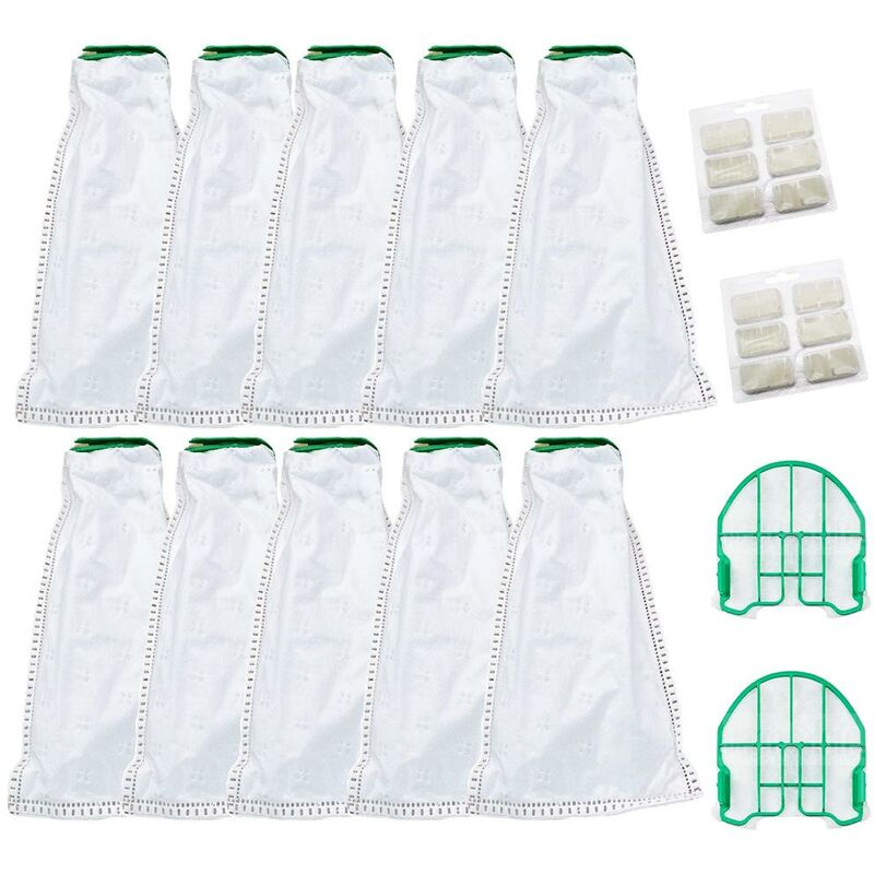 KIT 10 SACCHETTI FOLLETTO VB100 PROFUMI FILTRI COMPATIBILI Kit completo per la manutenzione del Folletto senza fili VB100 Questo kit composto da 10 sacchetti vb100, 12 profumi e 2 filtri protezione motore copriranno circa un anno di pulizie! I sacchetti sono realizzati in microfibra di altissima qualità che ti permetteranno di trattenere fino al 99,9% di batteri, proteggendo sia la tua casa sia la tua famiglia da germi e batteri. Grazie alla capienza di circa 1 litro (800ml) potrai pulire per circa 1 mese / 1 mese e mezzo senza doverti preoccupare di sostituire il sacchetto del tuo Folletto VB100. Quando arriverà il momento di sostituirlo ti basterà aprire l'apposito vano, sganciare il vecchio sacchetto dal bocchettone ed inserire il nuovo. Niente di più semplice! Ti raccomandiamo di sostituire regolarmente il sacchetto e non di svuotarlo ed inserire ancora il vecchio in quanto perderai il potere filtrante, oltre al rischio di rovinare il Folletto! I filtri protezione motore anche