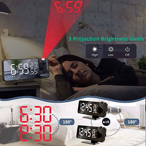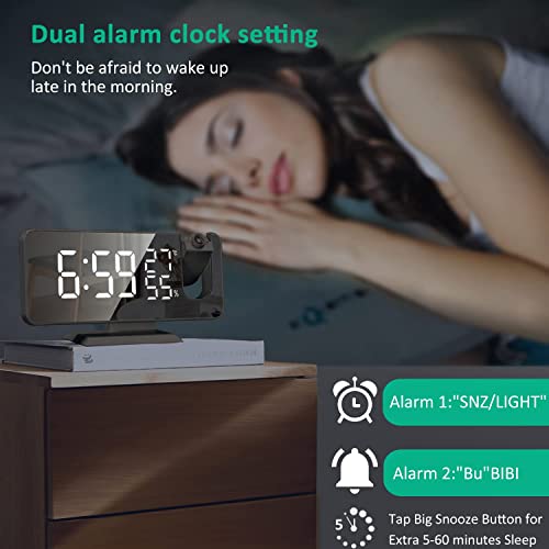 BIGFOX Sveglia con Proiettore, Sveglia digitale da Comodino 7,4 Pollici Display LED a 180° Luminosità a Proiezione Rotante Regolabile,Radio FM,Doppio Allarme, Snooze,Radiosveglia