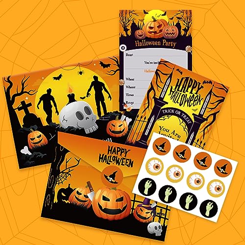 【Set di inviti per feste di Halloween】: Riceverai 12 pezzi Halloween buste +12 pezzi biglietti invito compleanno bambini Halloween +12 pezzi adesivi Halloween. Lasciate che voi e tutti i vostri amici spaventino da questi inviti suggestivi e terribili nel design del cimitero horror e una festa spaventosa sarà sicuramente bella!