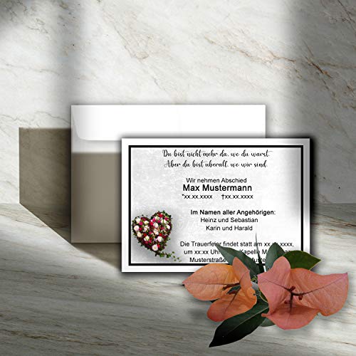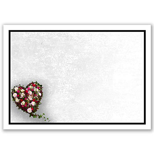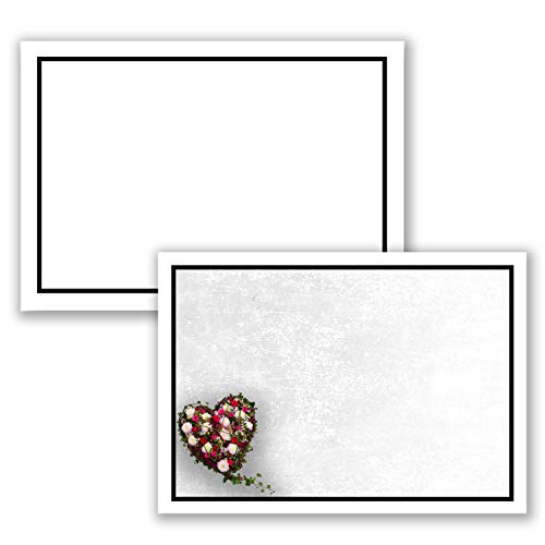 Set di 100 biglietti di lutto DIN A6 + buste per lutto DIN C6 - motivo: cornice nera con cuore di fiori - 10,5 x 14,8 cm - stampabili - Set di biglietti di condoglianze, per ringraziamento.